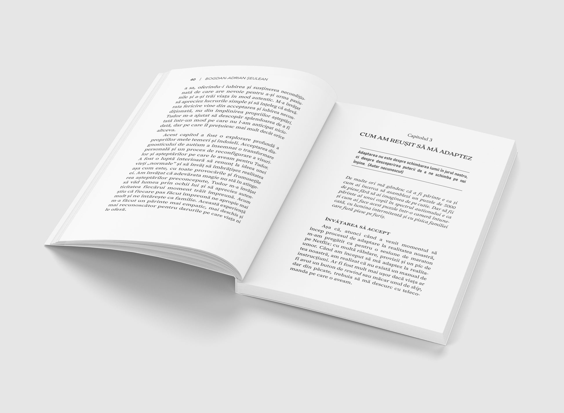 Am “devorat-o” în câteva ore (cu mici pauze neprevăzute). Este o carte plină de sensibilitate, curaj, adevăr, o carte care rămâne cu tine mult timp după ce ai închis-o. Apreciez mult faptul ca ai ales să împărtășești lumii o parte atât de personală. M-am regăsit în multe dintre trăiri…Felicitări pentru tot ce ai reușit și ai devenit, Bogdan!